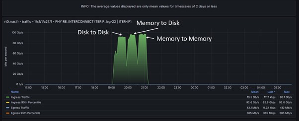These tests consisted of two coordinated campaigns: one led by ITER using the ITER.Sync parallel rsync tool, and another led by QST using MMCFTP and FDT. Both aimed to validate end-to-end 100 Gbps transfers across the AER network under realistic operational conditions. The combination of these campaigns provided complementary insights — ITER.Sync representing practical, multi-file transfers for operational workflows, and MMCFTP/FDT demonstrating theoretical link saturation in controlled scenarios.